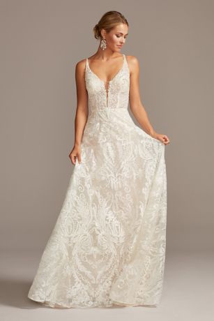 #CrystalBeaded | Featuring a layer of light-catching metallic filigree and an overlay of 15,000 artfully placed crystals, beads, and sequins, this lavish wedding dress will sparkle from every angle. Detailed with a sh